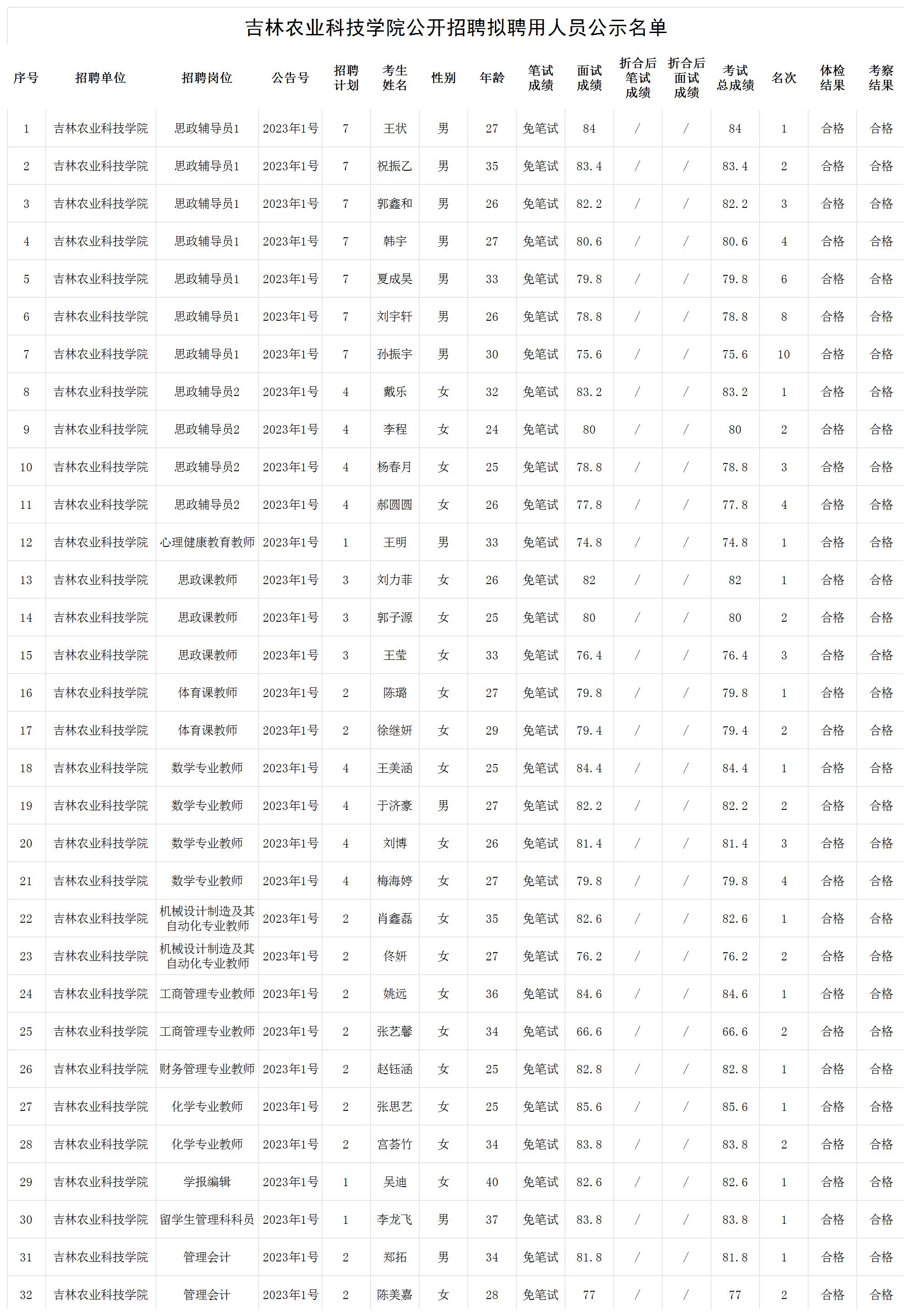 吉林农业科技学院公开招聘拟聘用人员公示名单