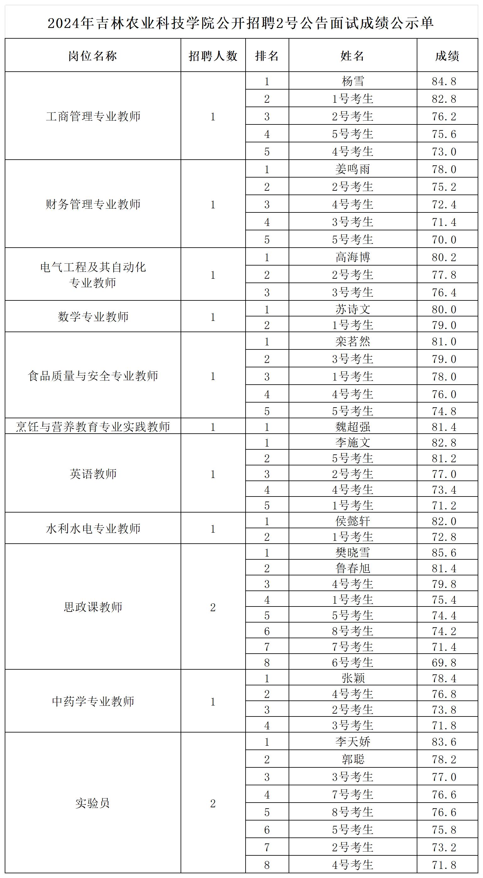 2024年吉林农业科技学院公开招聘2号公告面试成绩公示单
