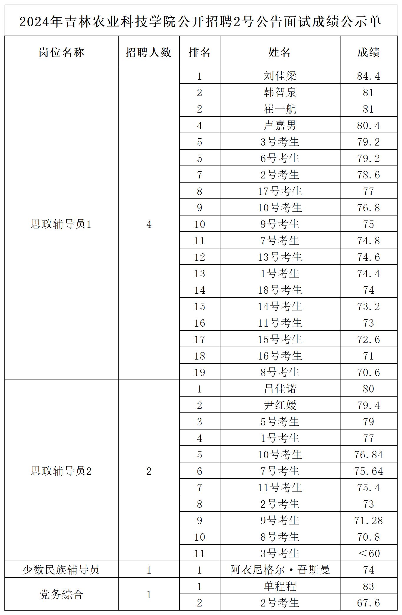 2024年吉林农业科技学院公开招聘2号公告面试成绩公示单