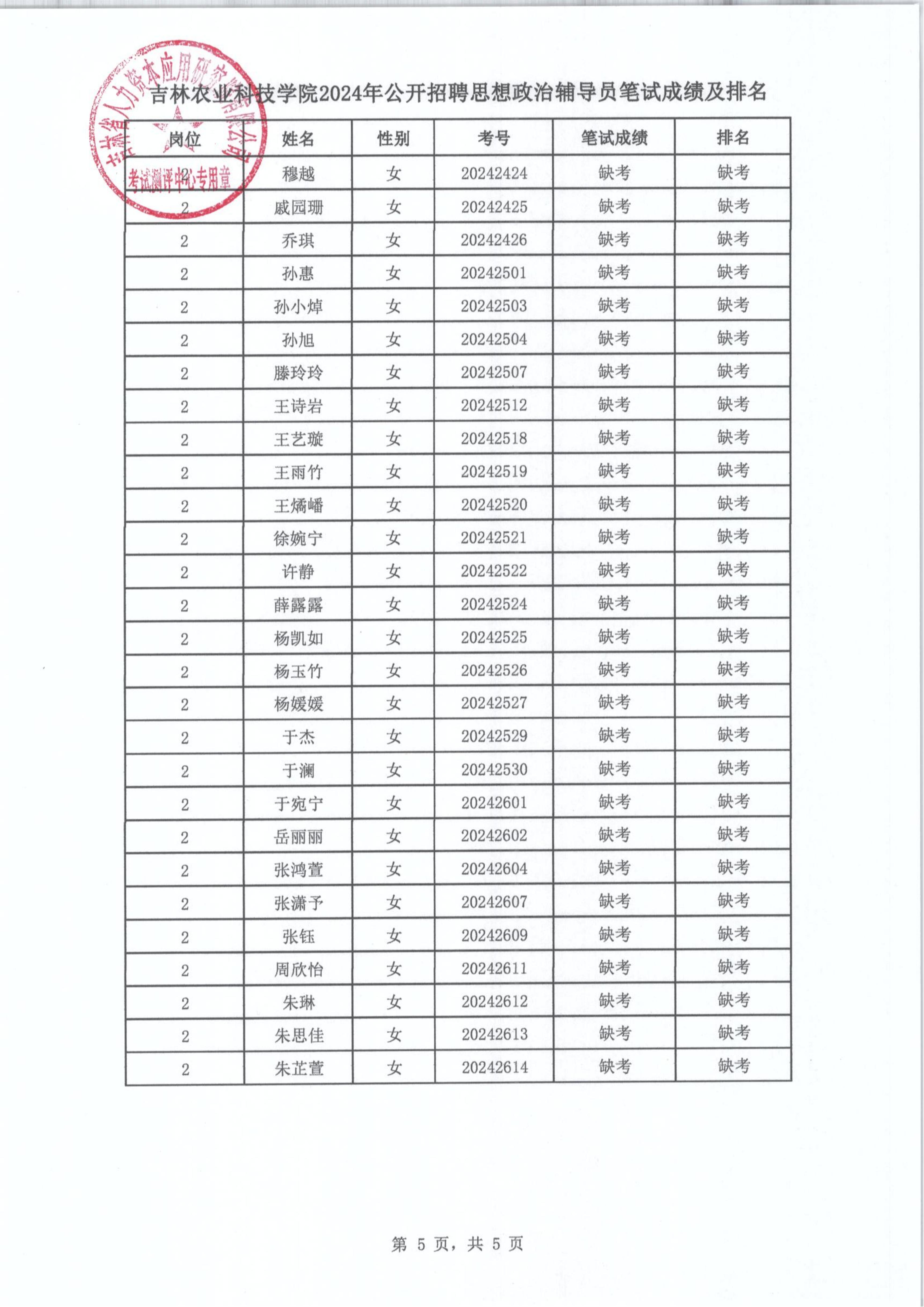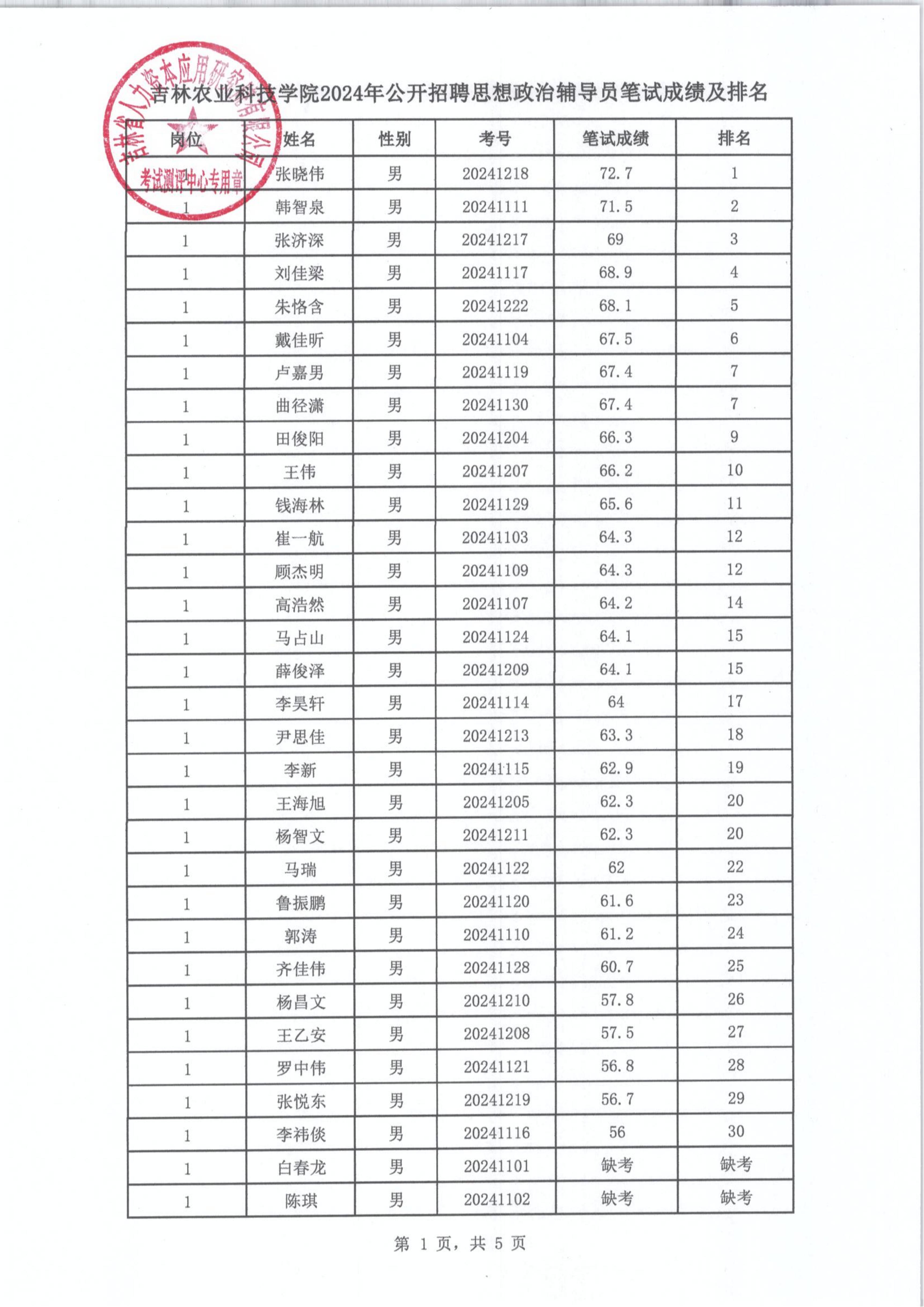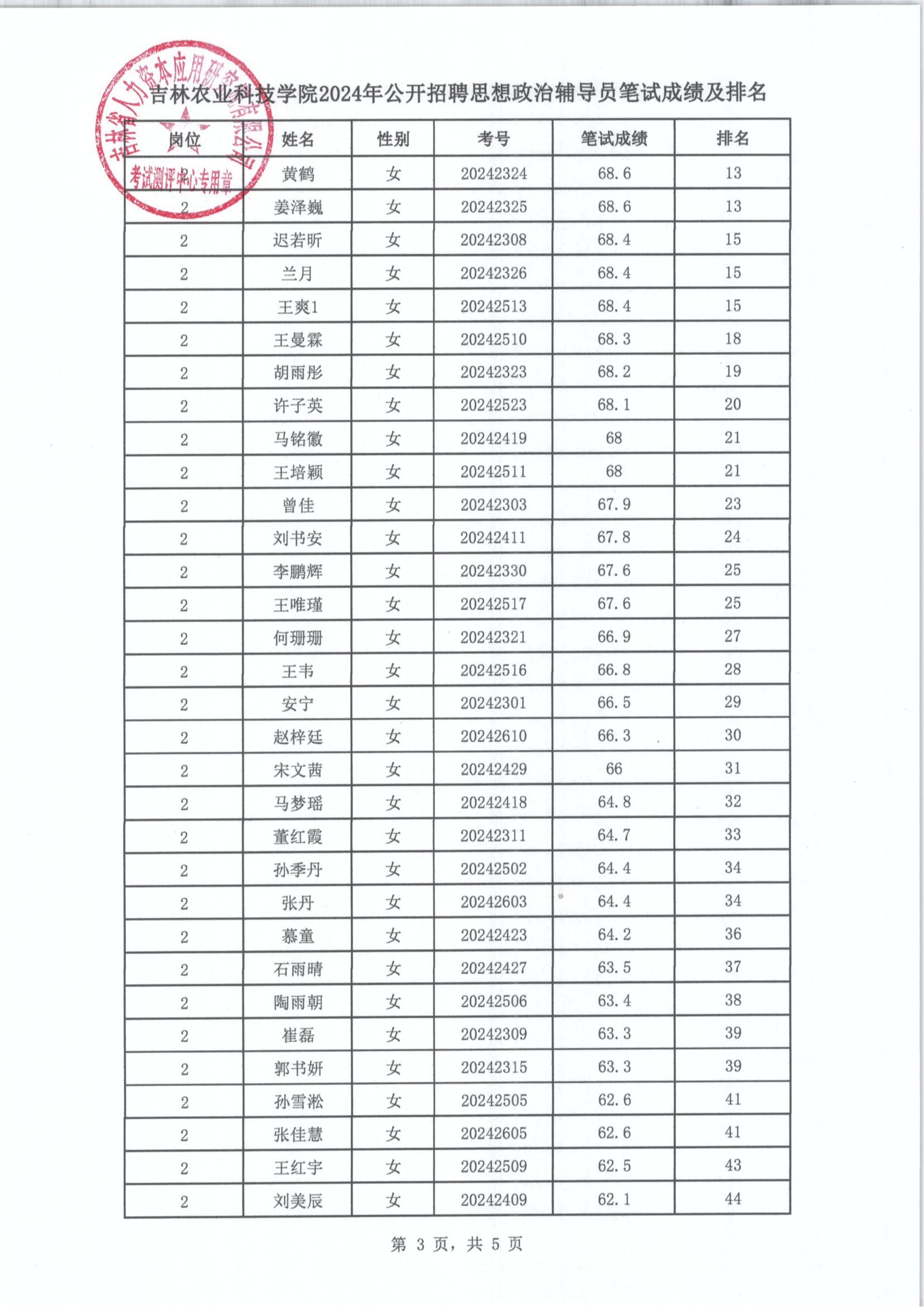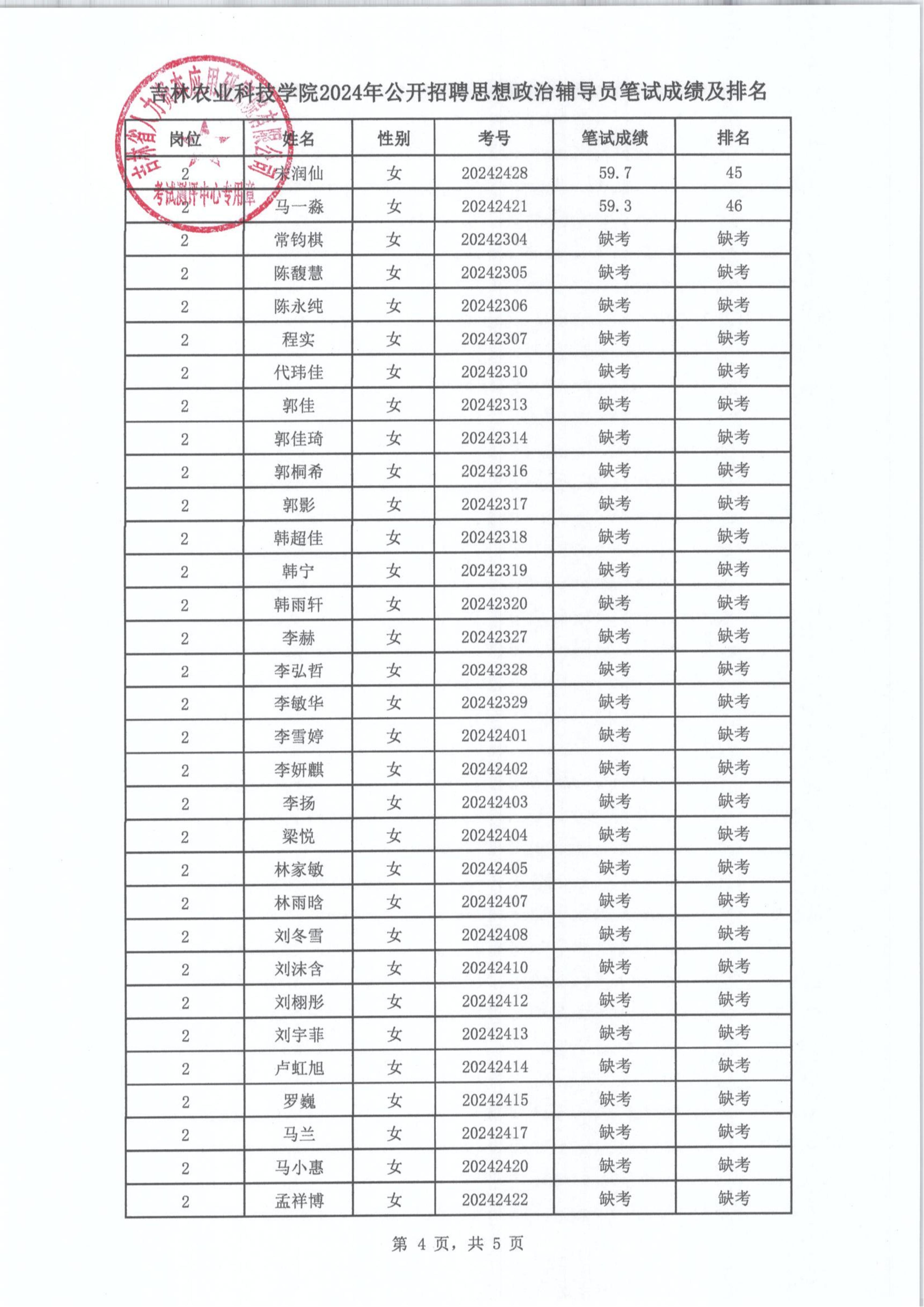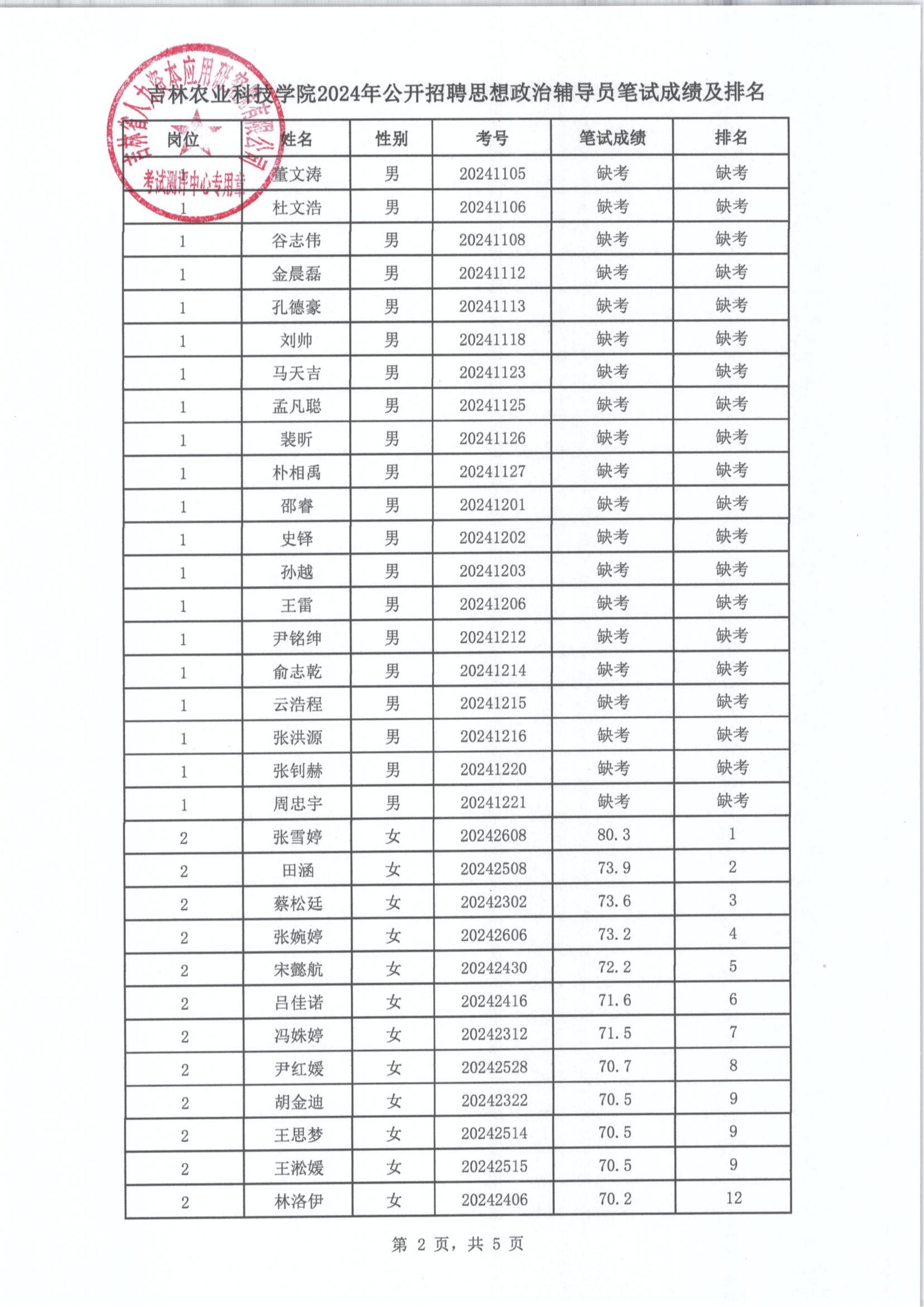 吉林农业科技学院2024年公开招聘思想政治辅导员笔试成绩及排名