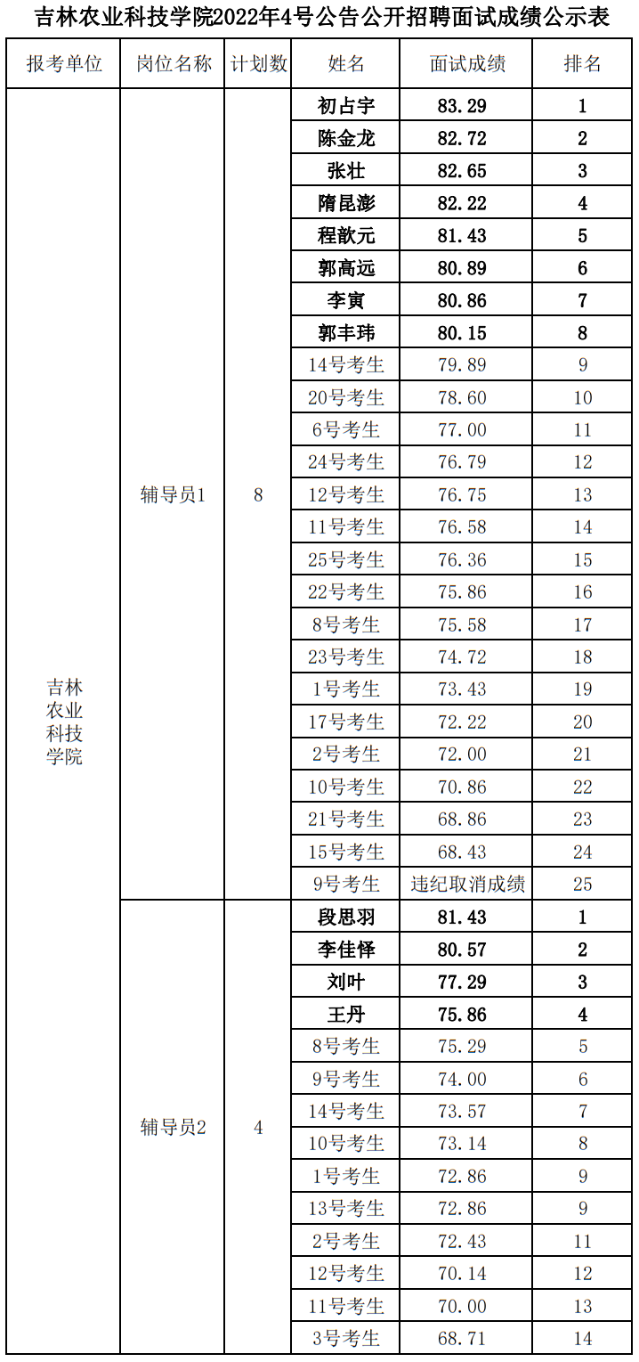 吉林农业科技学院2022年4号公告公开招聘面试成绩公示