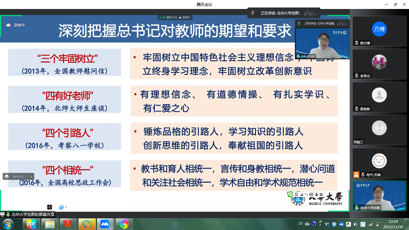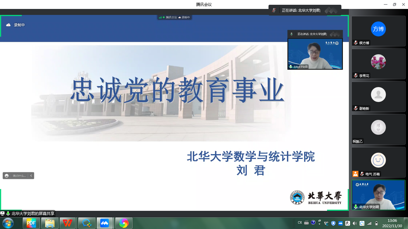 为加强师德师风建设,不断提升教师职业素养,电气与信工程学院邀请北华大学刘君教授于11月30日下午,通过腾讯会议组织开展了题为《忠诚党的教育事业》的线上报告。学院50余位教师听取了报告。报告由学院副院长侯方博主持。