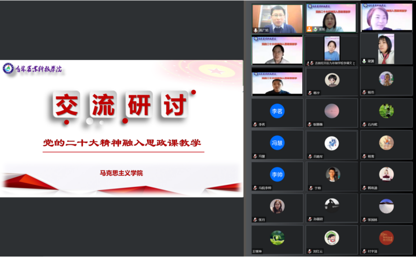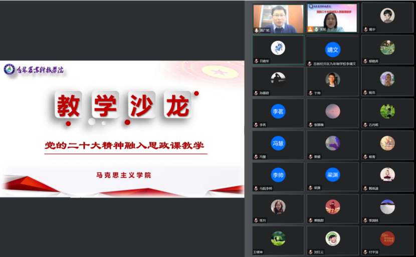 为了深入学习贯彻党的二十大精神,将党的二十大报告中的新观点、新论断、新思想充分及时地融入思政课教学中,使思政课教师增进思想交流,强化问题意识,提升学术研究能力,12月9日下午,马克思主义学院举办了“党的二十大精神融入思政课教学”主题教学沙龙活动。我校大中小学思政课一体化结对共建学校,吉林市经开区九年制学校副校长李靖文、吉林市第十八中学政治教研组组长丛文秋及两校思政课教师代表、我校全体思政教师参加了本次活动。活动由马克思主义学院副院长张旭主持。