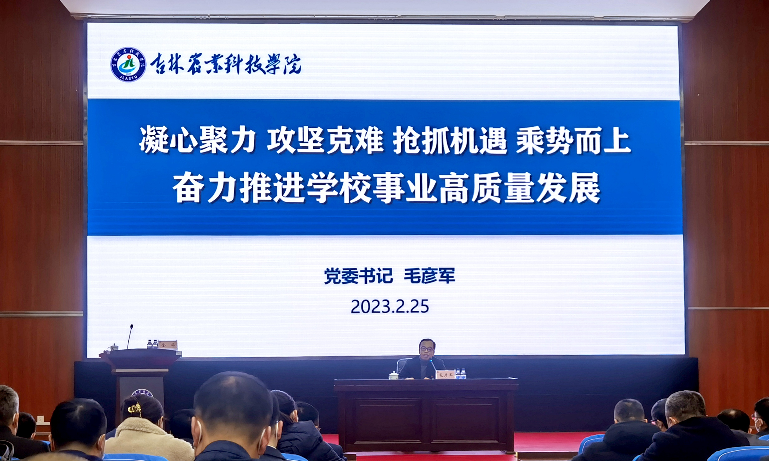 校党委书记毛彦军代表学校党委作开班讲话,他以《凝心聚力 攻坚克难 抢抓机遇 乘势而上 奋力推进学校事业高质量发展》为题,围绕中国式现代化这一主线,聚焦高质量发展这一主题,从党的建设、教育教学、科研创新、服务保障等方面对2022年工作进行了简要总结回顾,客观全面分析了学校发展面临的形势和问题,安排部署了2023年七方面重点工作任务。他强调,在推动学校高质量发展的过程中,全体干部要坚持以习近平新时代中国特色社会主义思想为指导,深入学习贯彻党的二十大精神,把牢社会主义办学方向,落实立德树人根本任务,坚定实施“内涵提升、特色立校、错位发展、开放创新、和谐包容、命运与共”六大工作理念,树立战略兴校意识、底线治校意识、学习强校意识、团结爱校意识及实干立校意识,进一步统一思想、统一意志、统一行动,以更加饱满的热情、更加昂扬的斗志、更加务实的作风,积蓄高质量发展新动能,主动融入吉林省“一主六双”高质量发展战略,以加快建成特色高水平应用型大学为奋斗目标,为早日建成社会主义现代化强国、为新时代吉林全面振兴全方位振兴做出吉林农业科技学院应有的贡献。